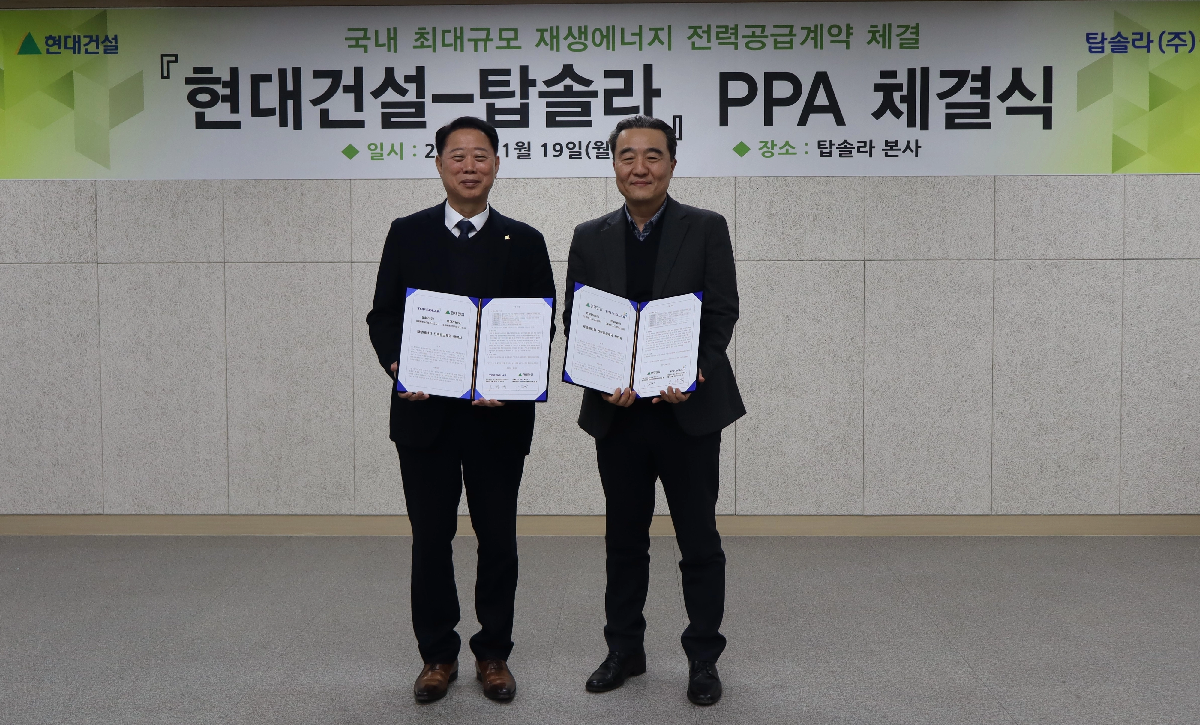탑솔라는 19일 광주시 북구에 위치한 탑솔라 본사에서 현대건설과 ‘재생에너지 전력공급계약(PPA) 체결을 위한 협약’을 체결했다.