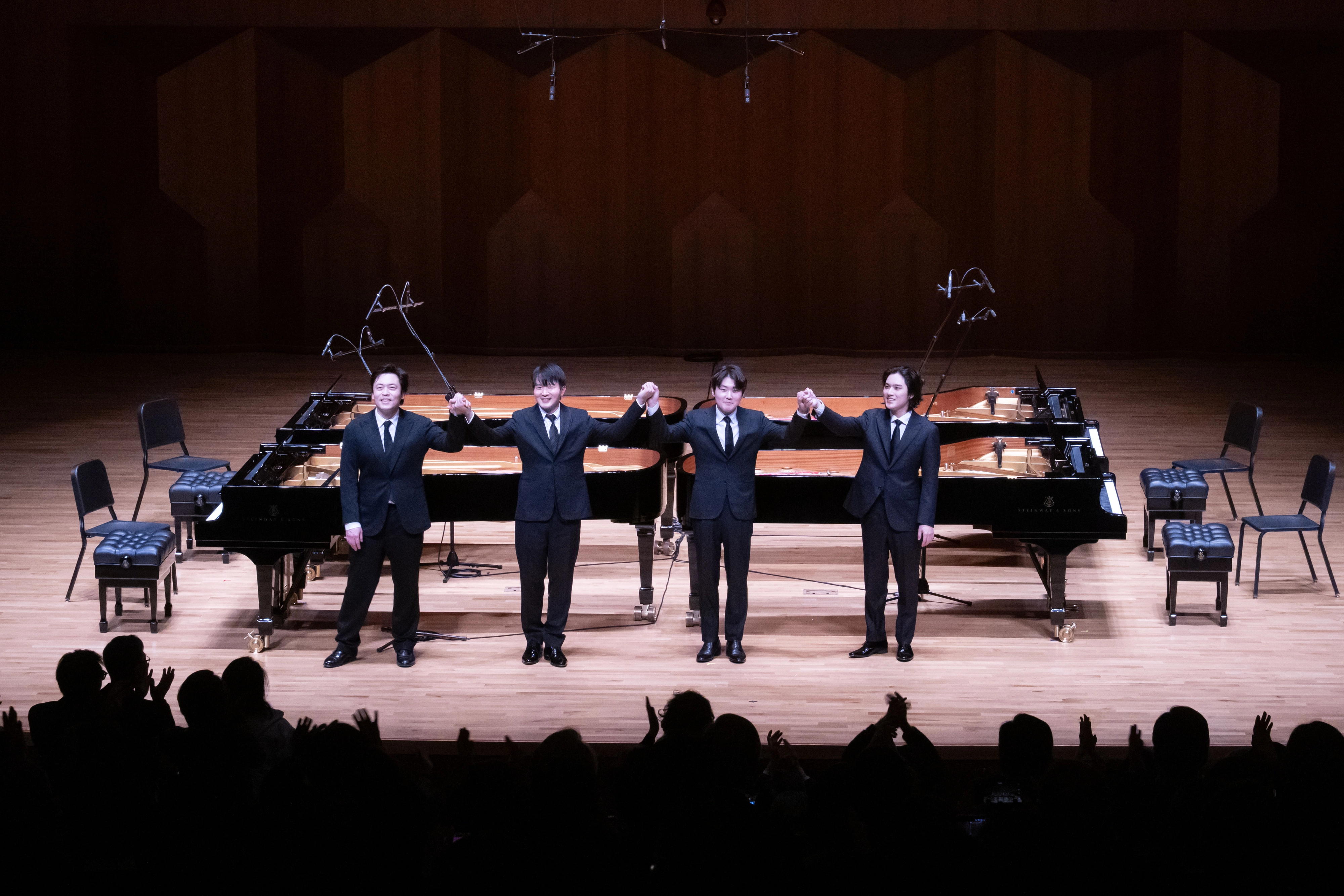 피아니스트 김선욱(왼쪽부터), 선우예권, 조성진, 임윤찬이 지난 25일 서울 서초구 예술의전당에서 열린 ‘아산 정주영 서거 25주기 추모음악회: 이어지는 울림’에서 연주를 마친 뒤 손을 맞잡은 채 관객들을 향해 인사하고 있다. 현대차그룹 제공