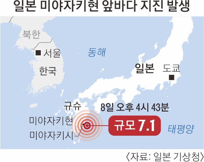 일본 기상청은 지난 8일 규슈 남부 미야자키현 니치난시 앞바다에서 규모 7.1의 지진이 나자 태평양 연안에서 거대 지진이 일어날 가능성이 평소보다 커졌다고 판단해 ‘난카이 해구 지진 임시 정보’를 처음으로 발표했다.