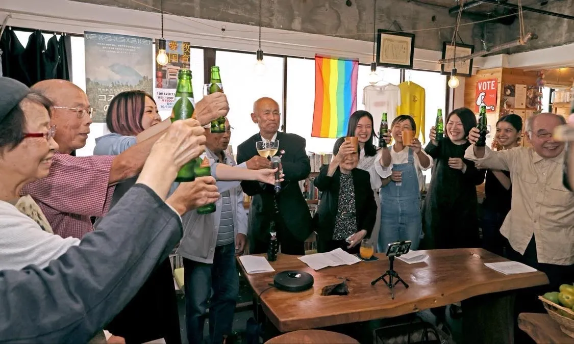 미마키 도시유키(왼쪽 다섯 번째) ‘일본 원수폭 피해자 단체 협의회’(니혼히단쿄) 공동이사장과 관계자들이 지난 13일 일본 히로시마의 한 카페에서 열린 축하연에서 젊은 반핵 시민단체 ‘히로시마 핵정책 청년유권자협회’(가쿠와카 히로시마) 회원들과 건배하고 있다. 니혼히단쿄는 68년간 핵무기 근절 운동을 펼쳐 온 공로로 지난 11일 노벨평화상을 받았다. 가쿠와카 히로시마 제공
