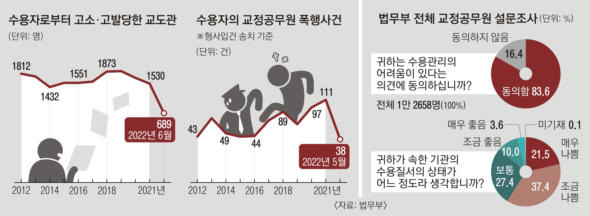 교도관이 현장에서 겪는 어려움은 설문조사뿐 아니라 객관적 통계에서도 드러난다. 수용자로부터 폭행 피해를 입은 사건은 2012년 43건에서 지난해 111건으로 최근 10년 새 2.5배가량 늘어 역대 최대치를 기록했다.