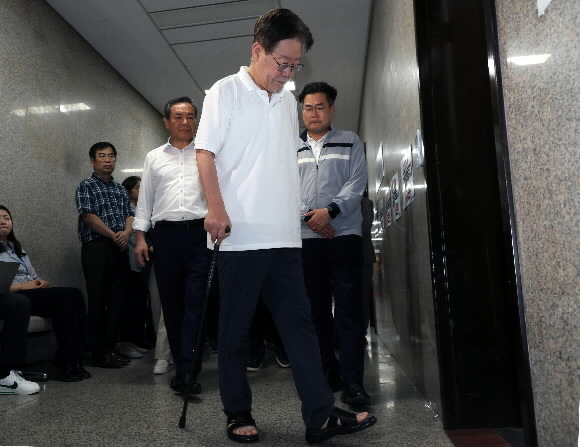단식 중인 더불어민주당 이재명 대표가 지난 17일 수척해진 모습으로 당 대표실 앞을 걸어가고 있다.