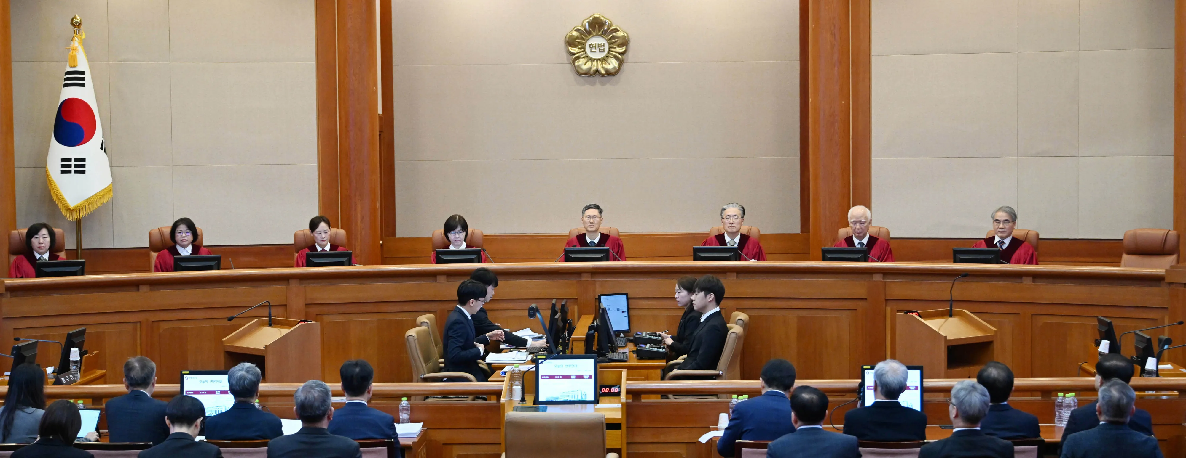 헌법재판관들이 11일 서울 종로구 헌법재판소에서 열린 윤석열 대통령 탄핵심판 7차 변론에 입장해 있다. 2025.2.11