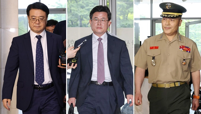 채상병 사망 당시 경북경찰청장이었던 최주원(왼쪽부터) 경찰청 미래치안정책국장, 윤석열 전 대통령의 복심으로 불려 온 강의구 전 대통령실 부속실장, 채상병 사망 사건 초동조사 당시 수사외압을 폭로했던 박정훈 해병대 수사단장(대령)이 16일 서울 서초구 순직해병특검 사무실에 출석하고 있다. 연합뉴스
