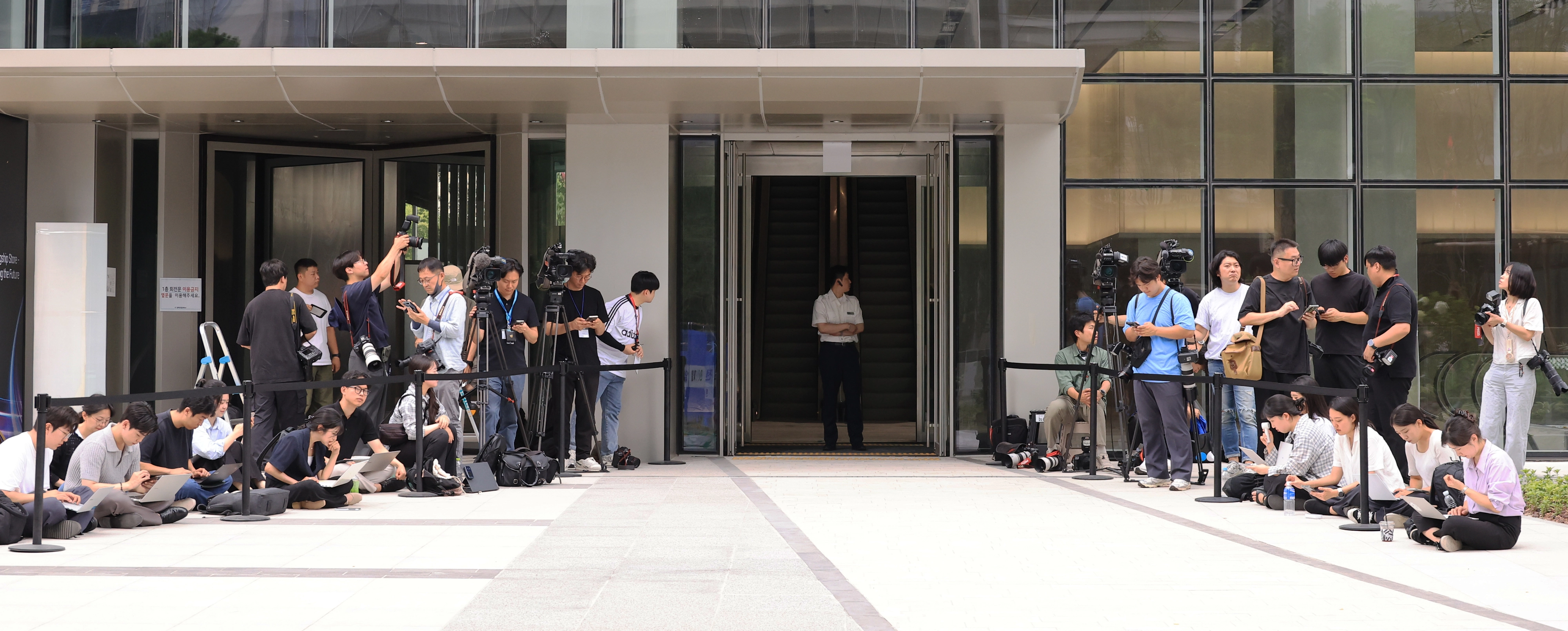윤석열 전 대통령이 김건희 여사와 관련한 여러 의혹을 수사하는 민중기 특별검사팀의 소환 조사에 재차 불출석했다. 특검팀은 30일 오전 10시 종로구 KT광화문빌딩 웨스트에 마련된 사무실로 윤 전 대통령을 불렀으나 그는 출석하지 않았다. 사진은 이날 특검 사무실 앞에 대기중인 취재진. 연합뉴스