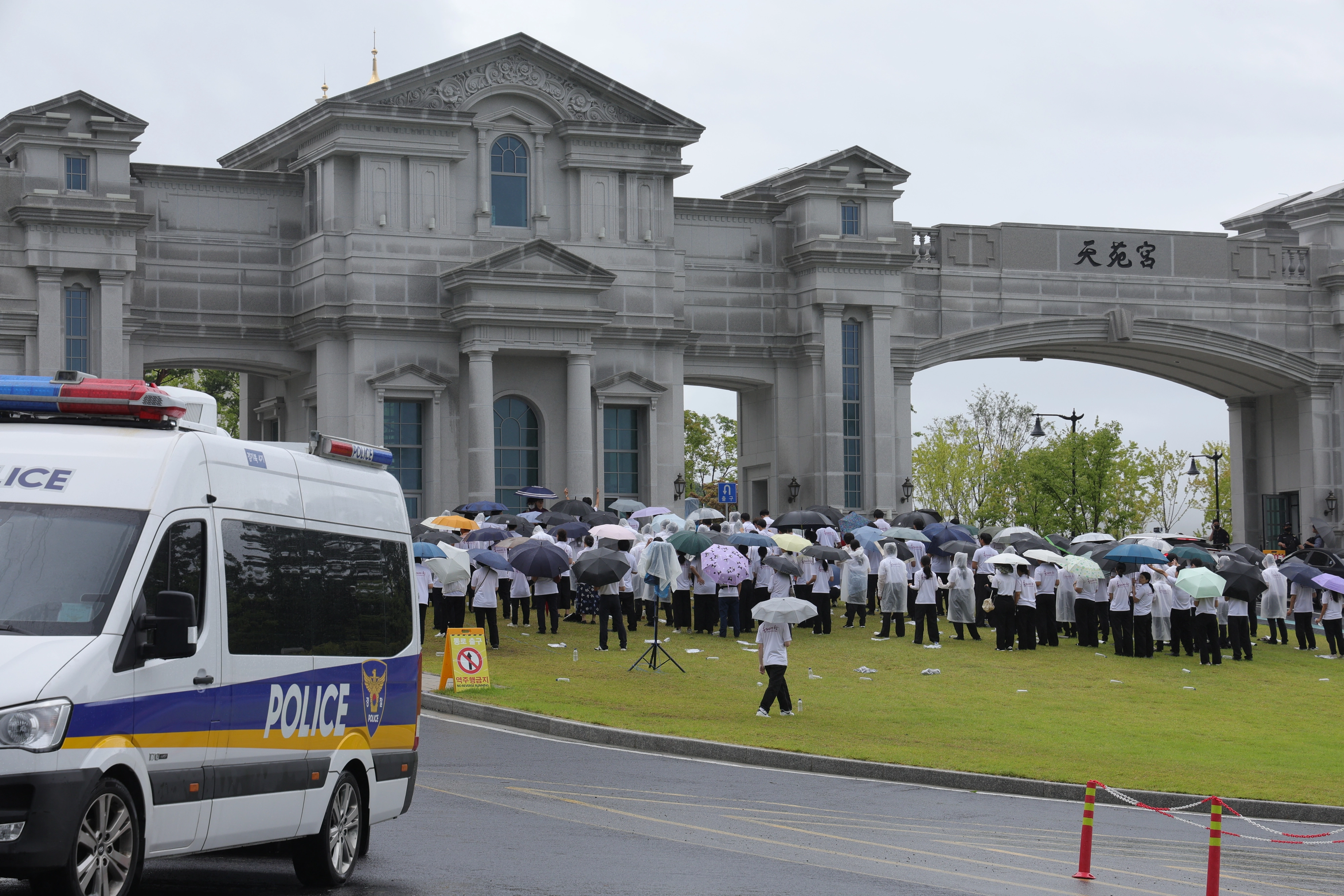 김건희 여사의 각종 의혹들을 수사하는 민중기 특별검사팀이 지난달 18일 경기 가평군 통일교 본부에서 통일교 시설과 관계자를 대상으로 압수수색을 진행하자 신도들이 집회를 열고 있다. 연합뉴스