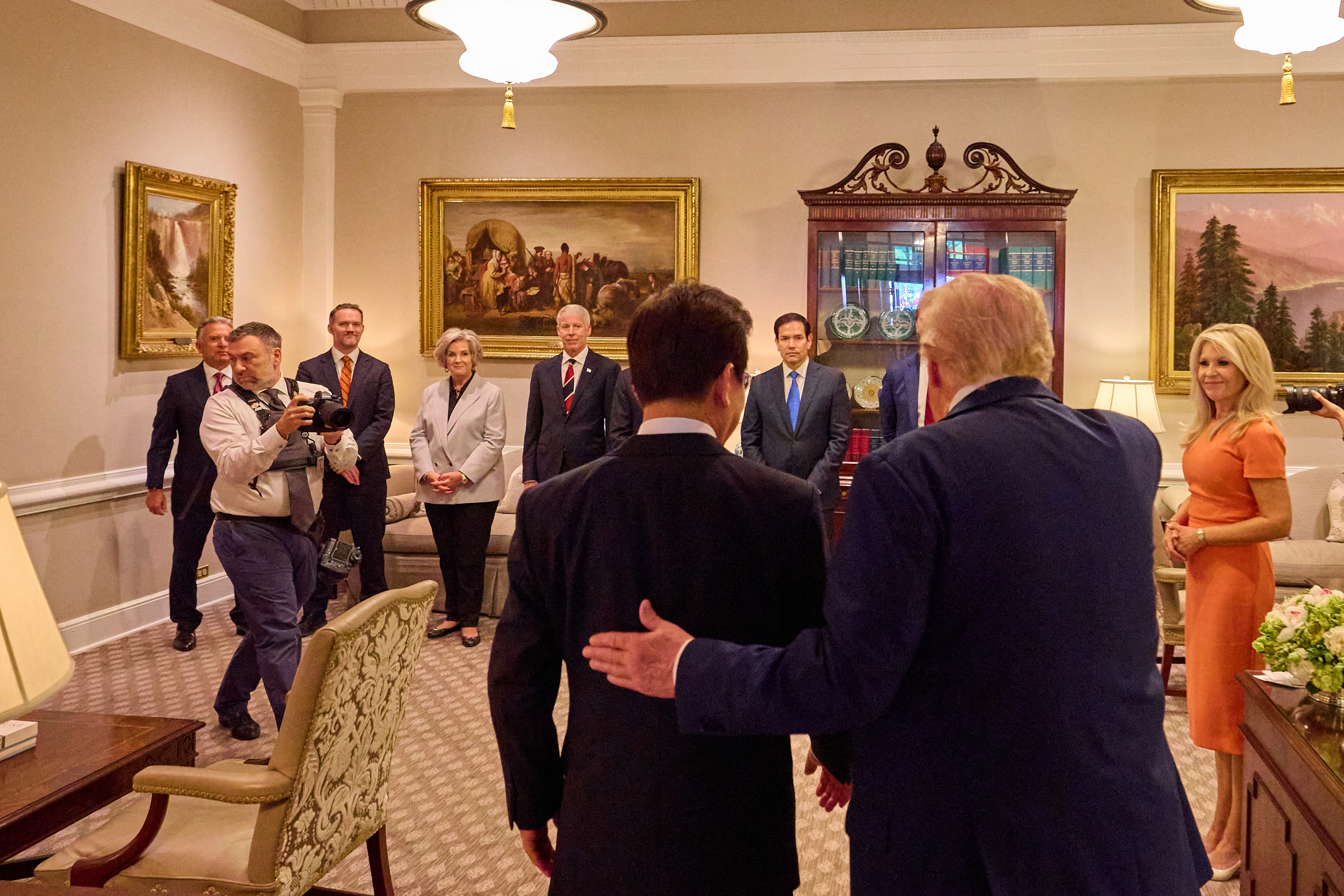 이재명 대통령이 25일(현지시간) 미국 워싱턴DC 백악관에서 한미 정상회담을 갖기 전 수지 와일스(왼쪽 세 번째) 비서실장을 비롯한 참모진을 소개하려는 도널드 트럼프 미국 대통령의 안내를 받고 있다. 워싱턴DC 연합뉴스