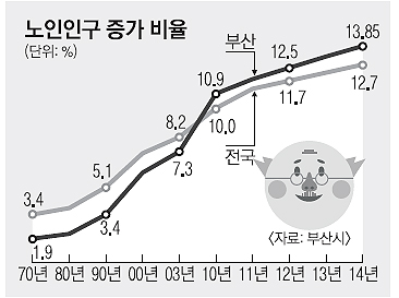 한편 전체 인구 중 65세 이상 노인인구 비율이 7% 이상 14% 미만이면 ‘고령화 사회’, 14% 이상 20% 미만일 때를 고령사회라고 하며 우리나라의 노인인구 비율은 2000년 7%를 넘어섰고 지난해 말 12.7%를 기록했다. 부산은 2003년 7%를 넘어선 데 이어 다음달 14%를 돌파할 것으로 보인다.