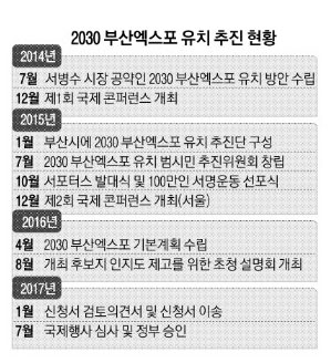 2030년 엑스포 유치는 서 시장 공약 사항이다. 시는 지난해 8월 시 산하 부서에 엑스포추진단을 신설하는 등 유치 준비를 해오고 있다. 지난해 12월에는 전문가, 정계, 학계, 지역경제계, 시민사회단체 관계자 등 250여명이 참석한 가운데 ‘제1회 국제 콘퍼런스’ 행사를 성황리에 마쳤다. 시는 2017년까지 ‘엑스포 유치를 국가사업’으로 지정받고 이후 정부 승인을 받는다는 전략이다.