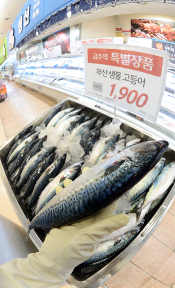 구울 때 미세먼지가 많이 발생한다는 환경부의 발표 등으로 고등어 값이 하락세를 보이고 있는 가운데 5일 서울의 한 대형마트 생선 코너에서 국내산 고등어가 마리당 1900원에 판매되고 있다.