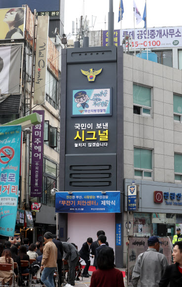 부산경찰청은 31일 중구 광복로에 경찰 무전기 모양의 창선치안센터를 열고 본격 운영에 들어갔다. 치안센터의 전면에는 가로 3.3m 세로 7.5m인 대형 무전기 모양 조형물이 설치됐다. ‘국민이 보낸 시그널 놓치지 않겠습니다’라는 문구가 적힌 이 조형물에는 발광다이오드(LED) 조명이 설치돼 밤에도 이색적인 모양을 감상할 수 있다.