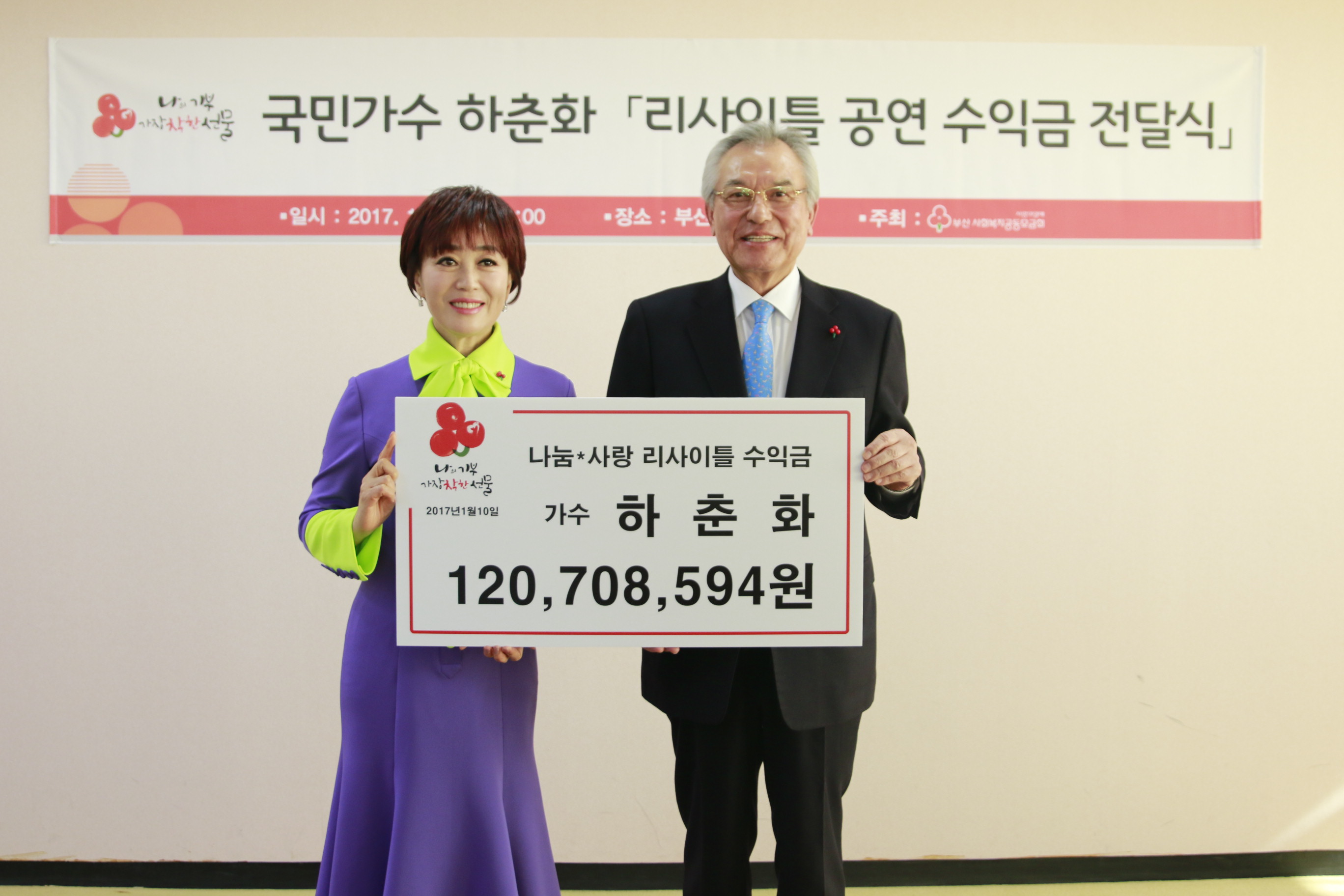 하춘화는 지난해 부산 공연을 앞두고 “노래 인생 55년을 기념하고, 오랜 세월 사랑과 성원을 보내주신 팬들에게 보답하려고 공연 수익금을 전액 부산지역 저소득층을 위해 사용하겠다”고 밝혔다. 만 6세부터 노래를 시작한 하춘화는 1971년 ‘물새 한 마리’로 데뷔해 ‘잘했군 잘했어’, ‘영암아리랑’, ‘우리 사랑 가슴으로’,‘날 버린 남자’ 등 수많은 히트곡을 발표했다. 지금까지 8500여 차례의 공연을 해 기네스북에도 실렸다.