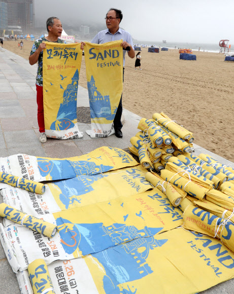 폐현수막 돗자리 어때요  10일 오후 부산 해운대구 해운대해수욕장에서 화덕헌(왼쪽) 바다상점(해운대관광기념품 홍보관) 대표와 구 관계자가 폐현수막으로 만든 돗자리를 선보이고 있다. 매년 피서객들이 버리고 간 일회용 돗자리로 몸살을 앓는 백사장을 보호하기 위해 해운대구가 만든 묘책이다. 피서객들에게 5000원에 빌려주고 반납하면 4000원을 돌려준다.<br>부산 연합뉴스