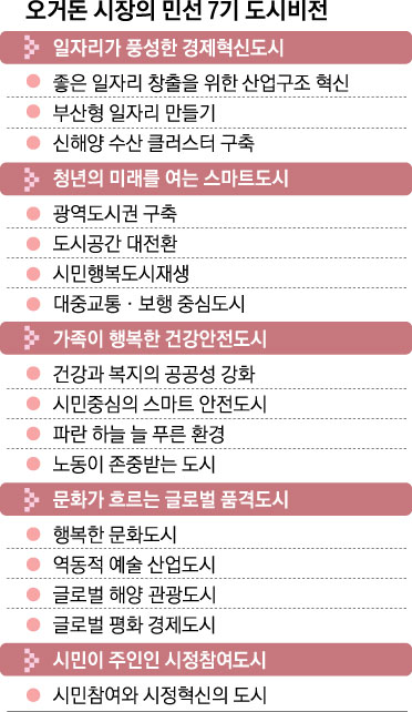 -시민 행복을 도시의 최우선 가치로 두고, 도시발전을 이끌어 갈 진정한 ‘동북아 해양수도’ 부산의 위상을 새롭게 정립할 계획이다. 일자리가 풍성한 경제혁신도시, 청년의 미래를 여는 스마트도시, 가족이 행복한 건강안전도시, 문화가 흐르는 국제품격도시, 시민이 주인인 시정참여도시 등 다섯 가지 목표를 정했다.