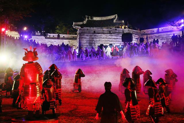 지난 14일 부산 동래읍성 북문광장에서 동래읍성역사축제 피날레 공연으로 치열했던 동래성 전투를 재현한 뮤지컬 공연이 펼쳐지고 있다. 1592년(선조 25) 4월 15일 임진왜란 발발과 함께 동래성이 왜군에 함락되며 당시 동래부사 송상현을 중심으로 양산군수 조영규과 수많은 읍민이 전사했다. 일본 측 기록에 따르면 전사자만 3000명을 웃돌았다.