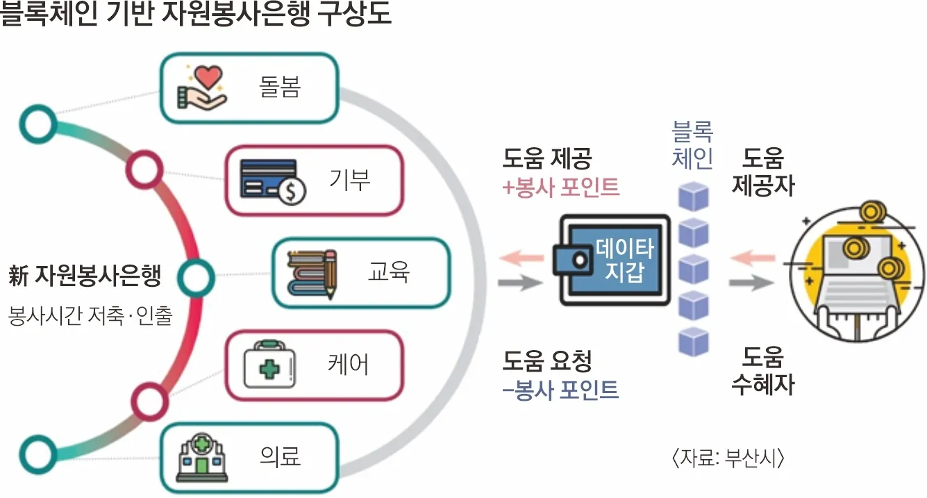 부산시는 ‘블록체인 기반 자원봉사 은행’을 내년 1월부터 정식 운영할 계획이라고 13일 밝혔다. 블록체인 기반 자원봉사 은행은 자원봉사 활동 시간을 포인트로 환산해 저축하고 필요할 때 이 포인트를 지급해 다른 봉사자의 도움을 받을 수 있도록 하는 교환 시스템이다.