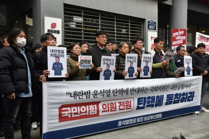 국민의힘이 윤석열 대통령 탄핵안 부결을 당론으로 정하자 부산에서 시민단체가 국민의힘 부산시당을 찾아 “탄핵에 동참하라”고 촉구했다. 시민단체는 성명문을 국민의힘 부산시당에 전달하려 했지만, 경찰이 막아서면서 30여분간 대치 상황이 벌어지기도 했다.