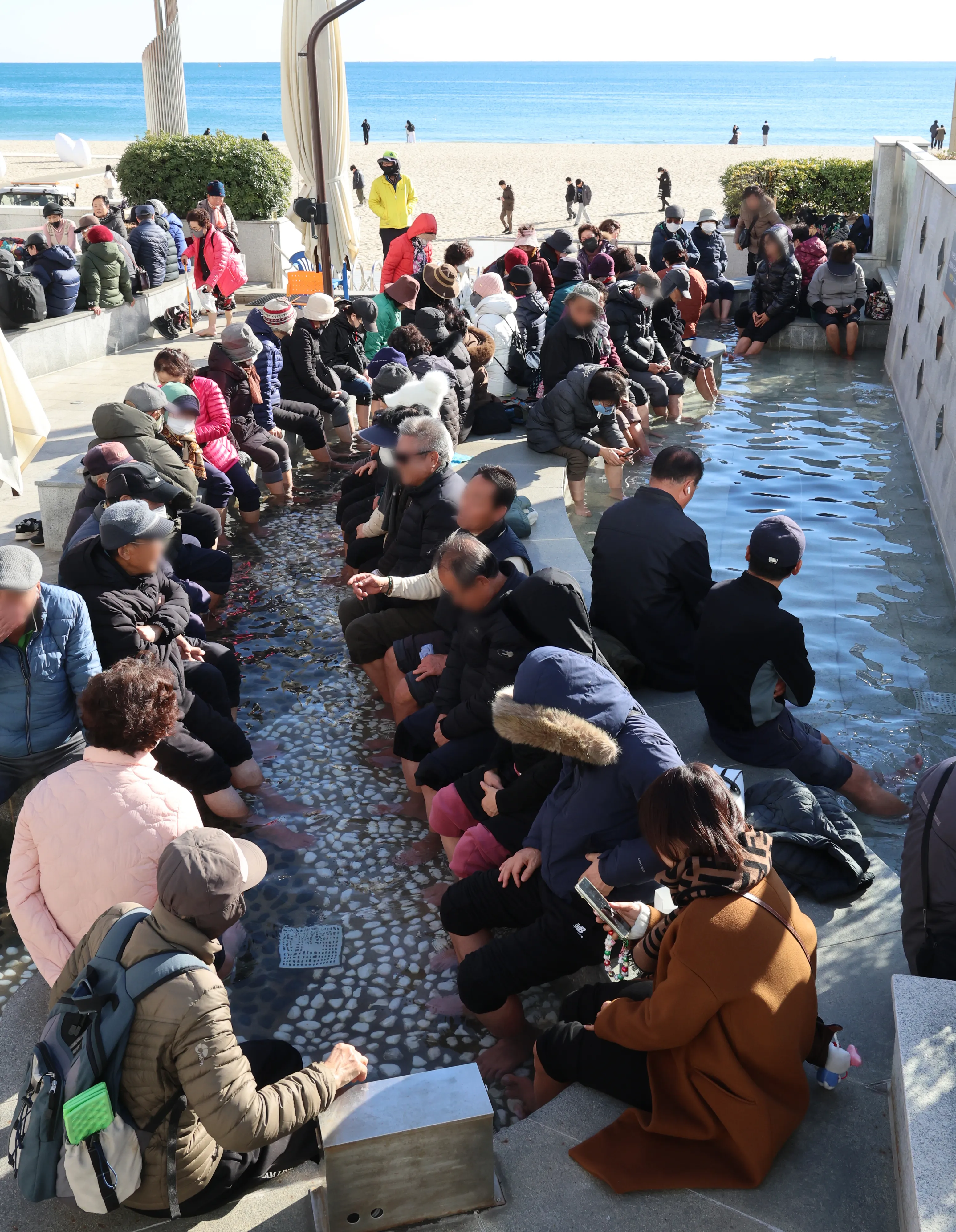 전국 곳곳에 한파특보가 이어진 23일 부산 해운대해수욕장 관광안내소 옆 온천 족욕탕을 찾은 시민들이 온천물에 발을 담그며 추위를 녹이고 있다.