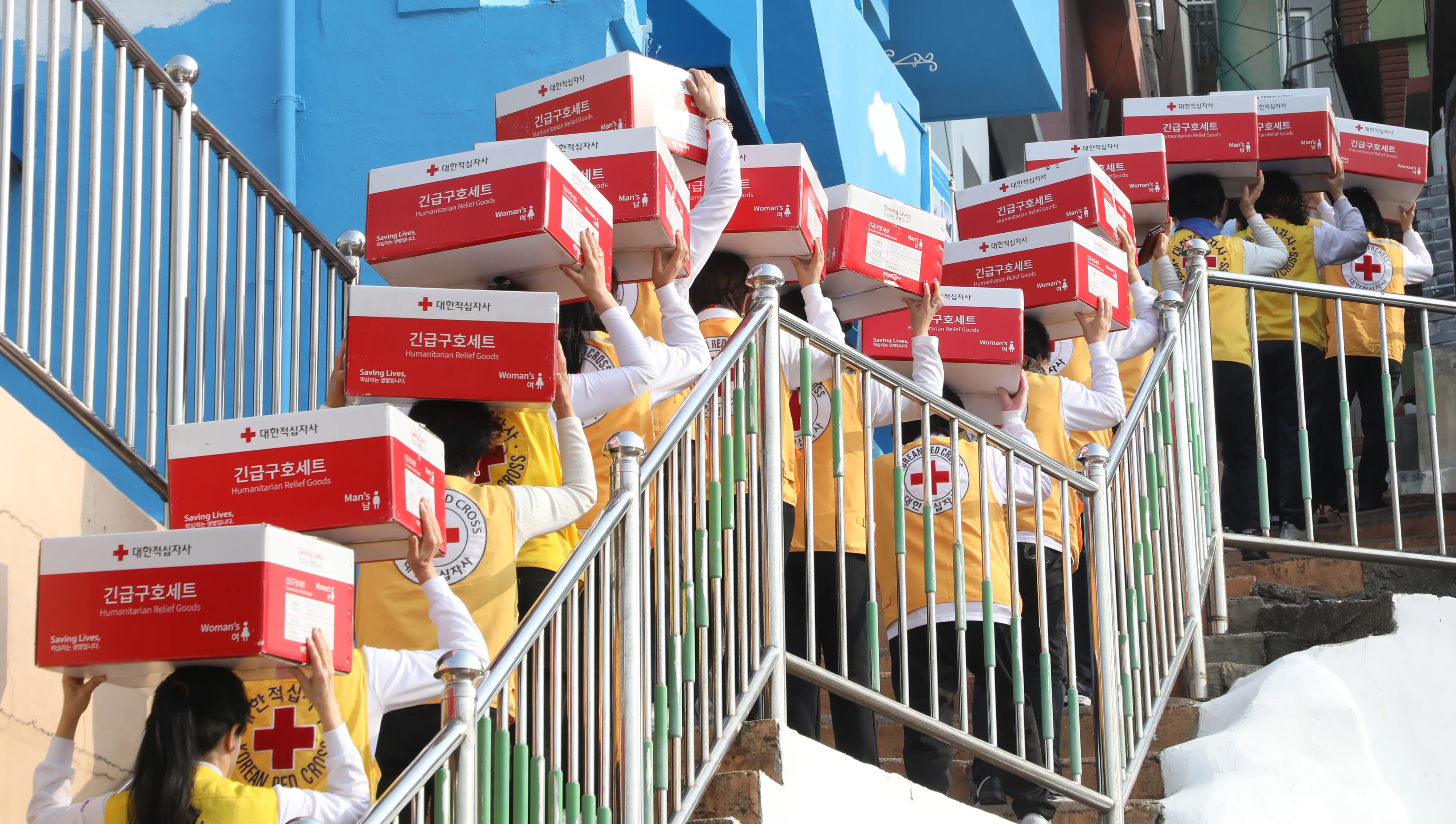 설 연휴를 앞둔 21일 오전 부산 사하구 감천문화마을 주택가에서 대한적십자사 부산지사 자원봉사원들이 취약계층에 전달할 구호품을 들고 가파른 계단을 오르고 있다. 대한적십자사 부산지사는 영양밥 세트 등으로 구성된 5200만원 상당의 구호품을 지역 내 취약계층 1940가구에 전달했다.