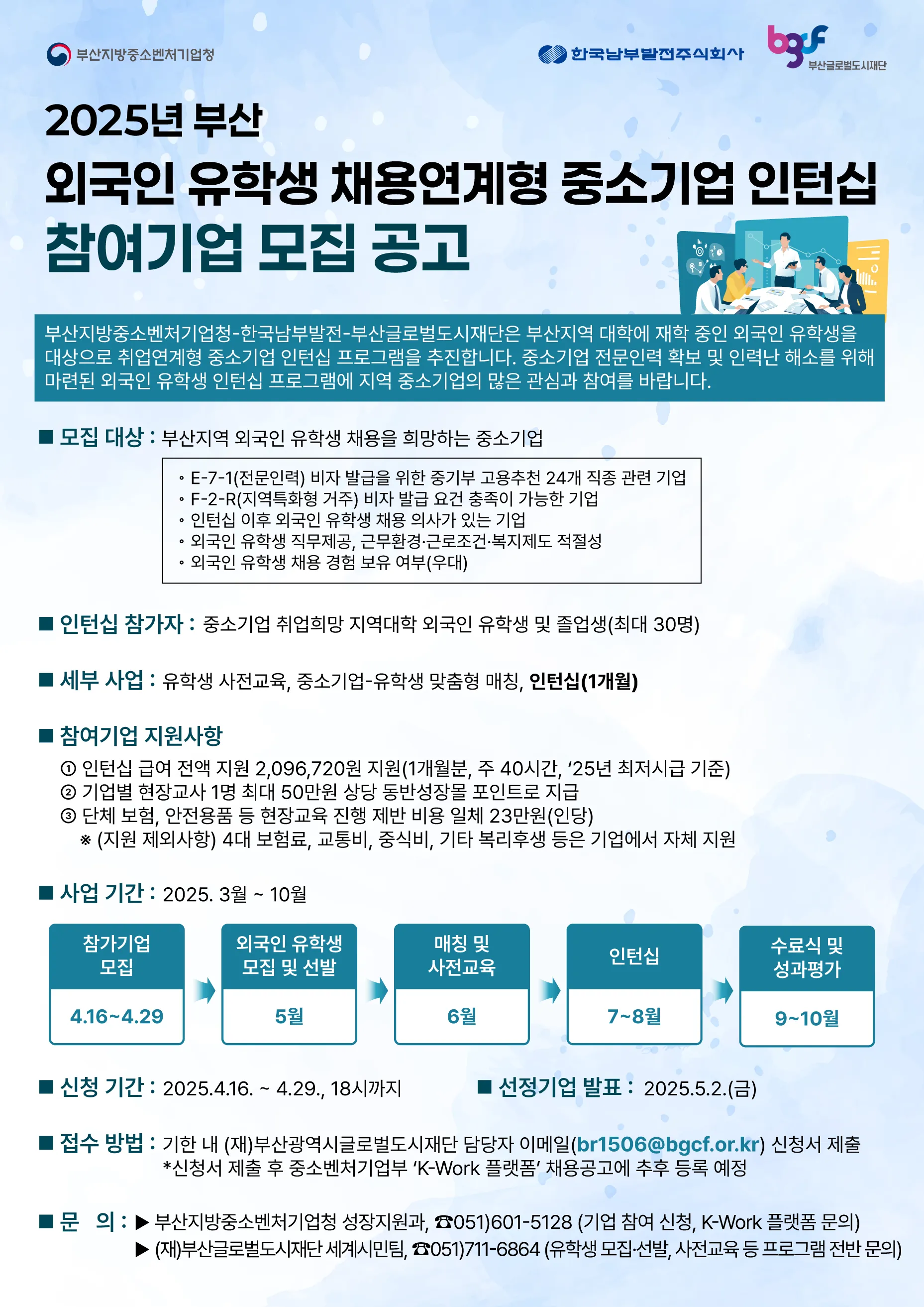 이 사업은 부산글로벌도시재단, 부산지방중소벤처기업청, 한국남부발전이 힘을 모아 처음으로 추진하는 협업 모델로, 외국인 유학생의 취업과 정착을 유도하고 중소기업의 인력난을 덜어주기 위해서다.
