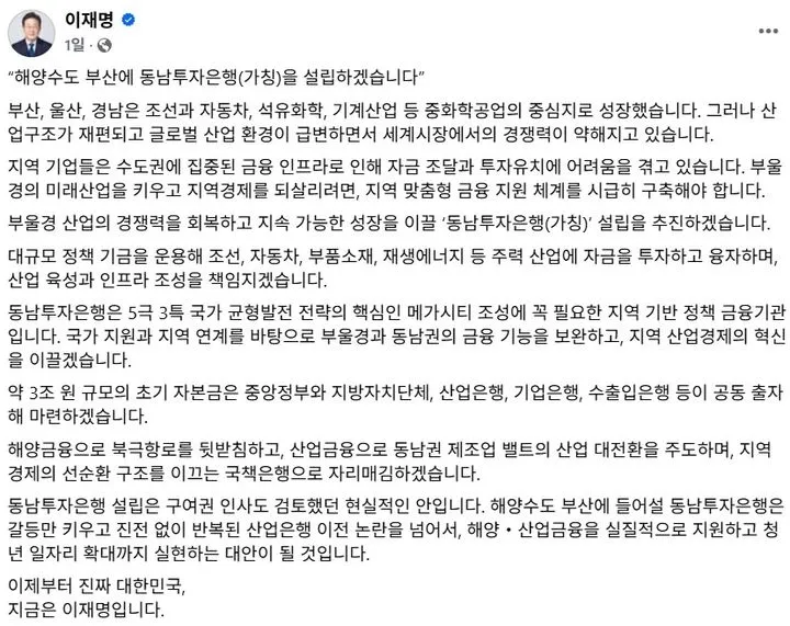 이 후보는 지난 1일 페이스북을 통해 “부울경(부산·울산·경남) 산업의 경쟁력을 회복하고 지속 가능한 성장을 이끌 ‘동남투자은행’ 설립을 추진하겠다”고 발표했다