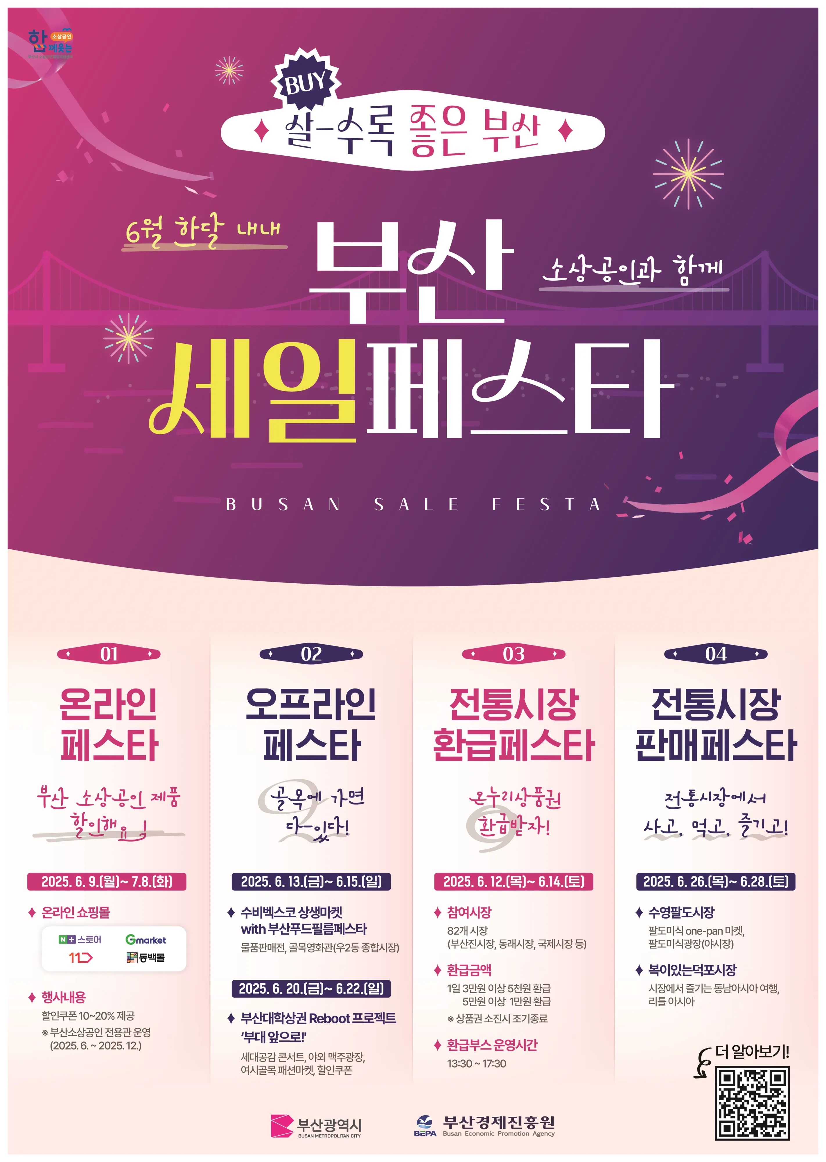 ‘2025 부산푸드필름페스타’와 연계해 수비벡스코상우회가 참여하는 지역상권 상생 행사로 상생 물품 판매전, 골목영화관, 상권홍보 뽑기 이벤트, 사회관계망서비스(SNS) 인증 이벤트 등이 운영된다.