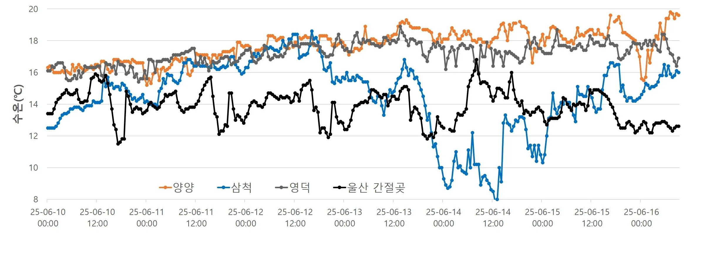 현재 동해안 연안 수온은 삼척 16도, 울진 나곡 14.7도, 영덕 16.9도, 간절곶 12.6도, 고리 14.4도, 부산 장안 14.5로 4월 초봄 때와 비슷한 상황이다.