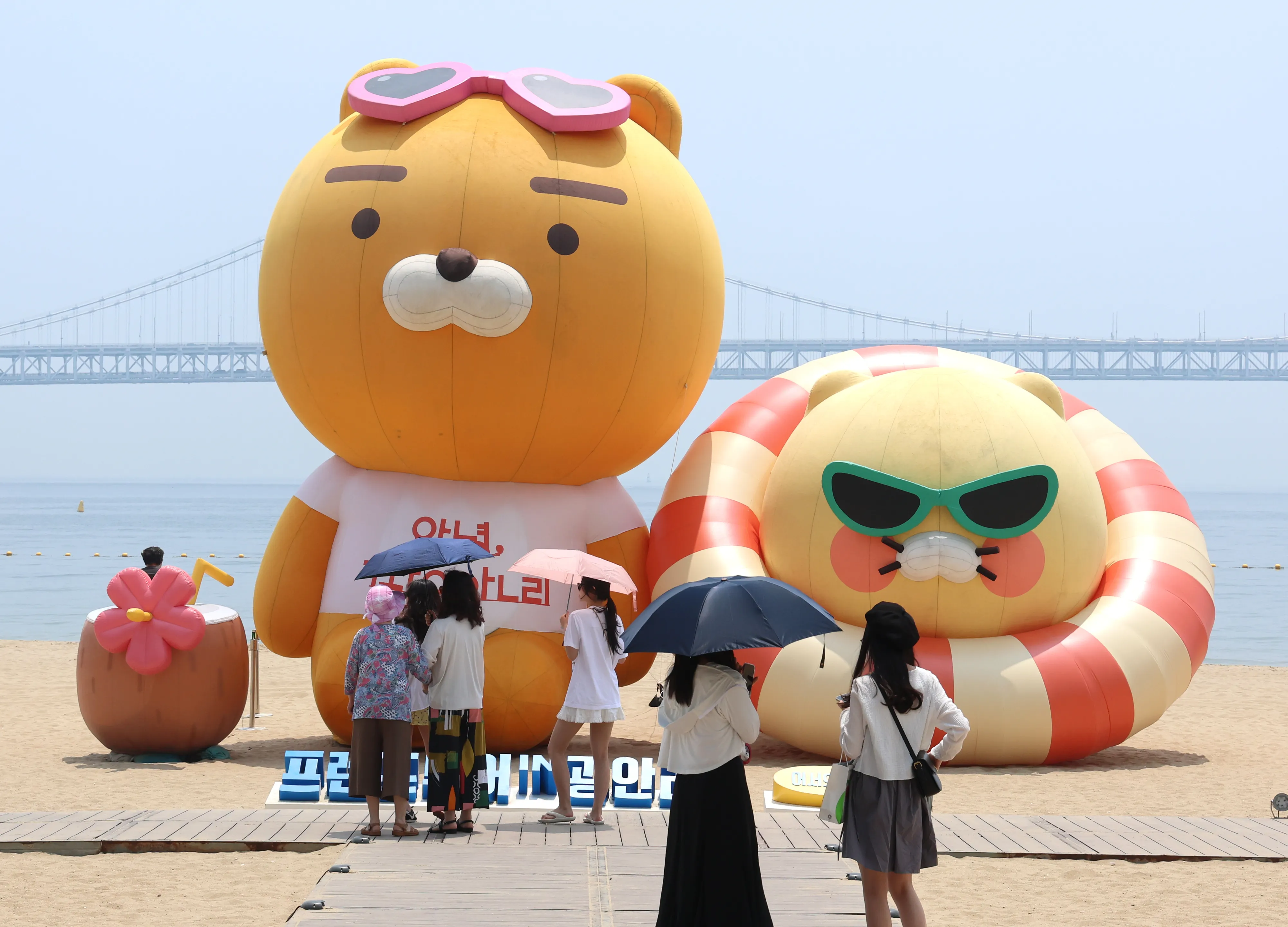 광안리해수욕장에 인기 캐릭터 라이언과 춘식이 설치