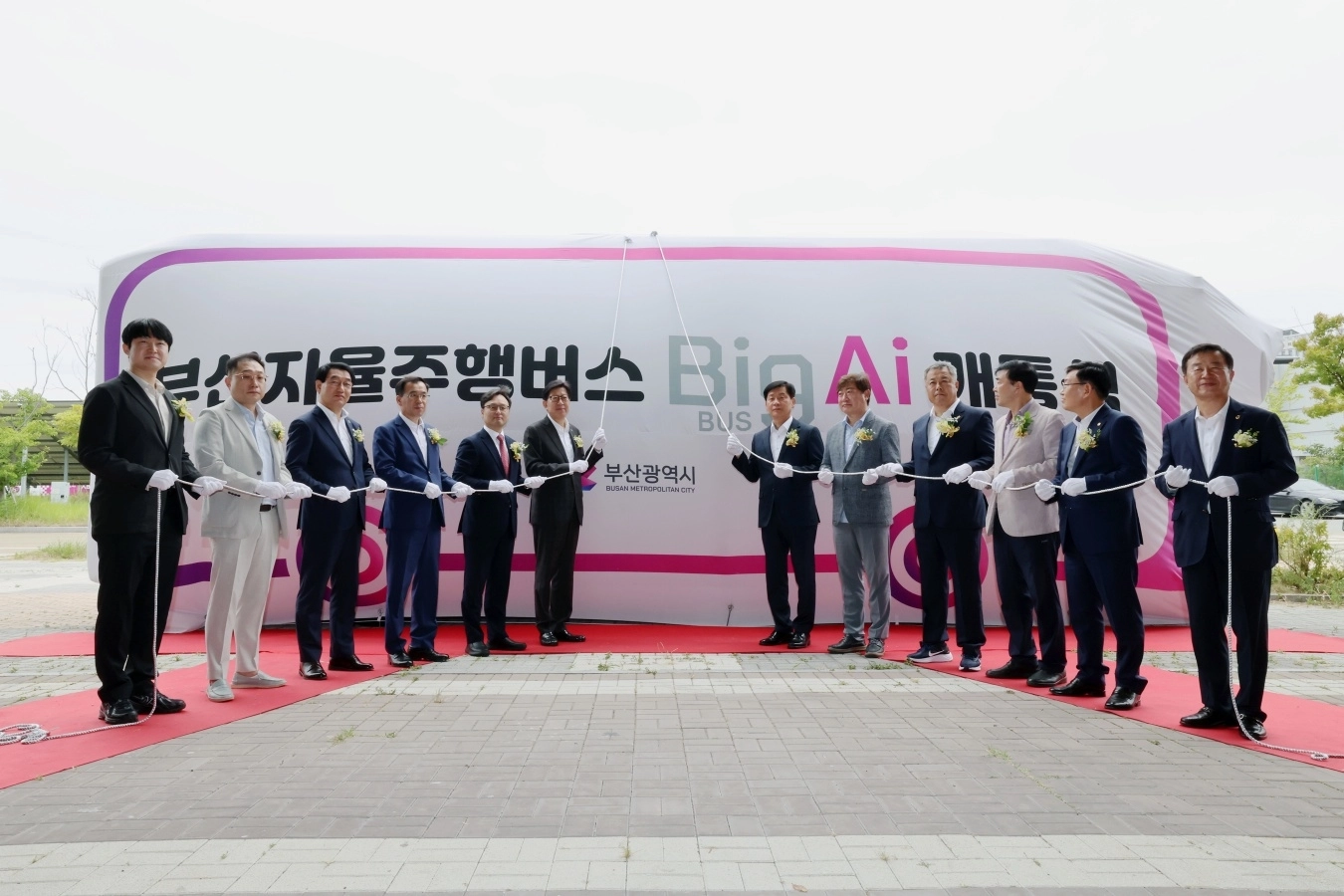10일 부산 동해선 오시리아역 광장에서 박형준 부산시장 등이 참석한 가운데 자율주행버스 개통식이 열리고 있다. 부산시 제공