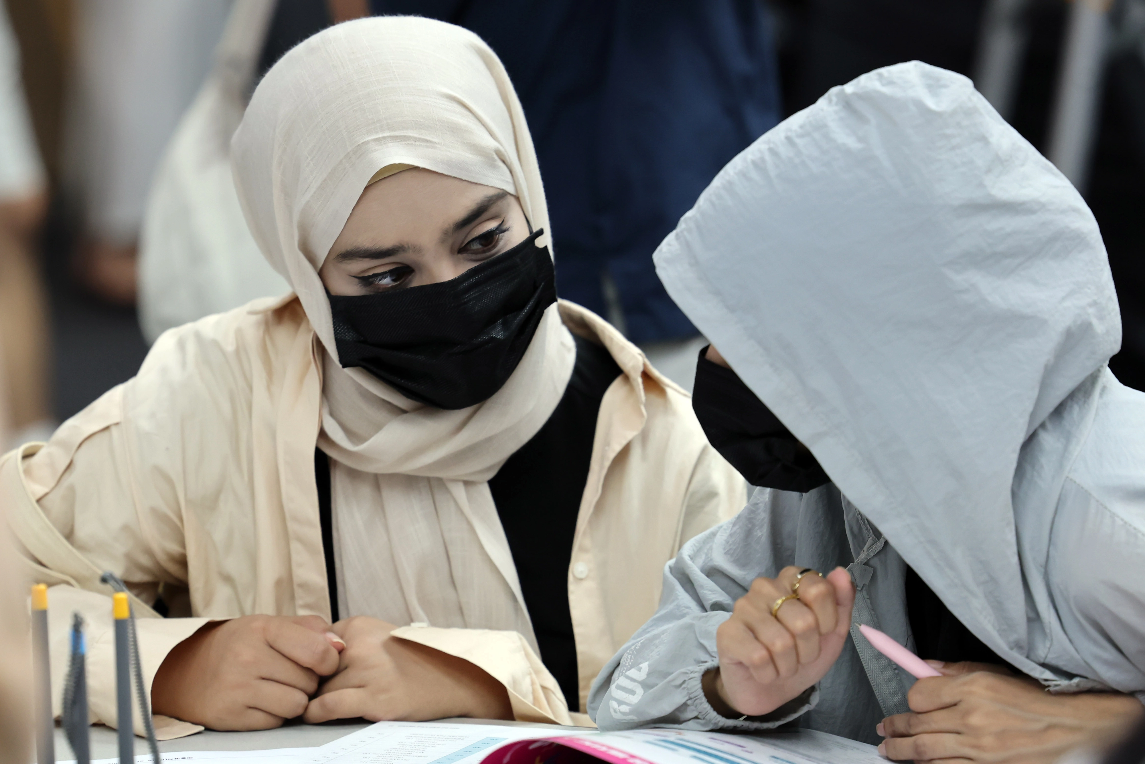 19일 부산 해운대구 벡스코 제2전시장에서 열린 ‘2025 외국인 유학생 채용박람회’에서 히잡을 쓴 유학생들이 구인업체 안내책자를 살펴보고 있다. 이날 행사에는 지역 제조업·호텔·컨벤션·무역·물류업 등 35개 기업이 참가했다. 부산 뉴시스
