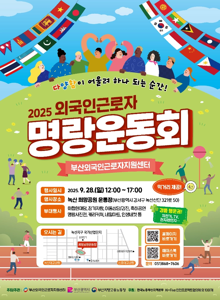 부산시는 28일 강서구 녹산 희망공원 운동장에서 부산외국인근로자지원센터 주최로 ‘2025년 외국인 근로자 명랑운동회’를 열었다. 이번 행사는 외국인 근로자와 부산 시민이 문화를 교류하고 친목을 다지는 자리로, 지난해 600명에서 올해 900명으로 참가 규모가 확대됐다.