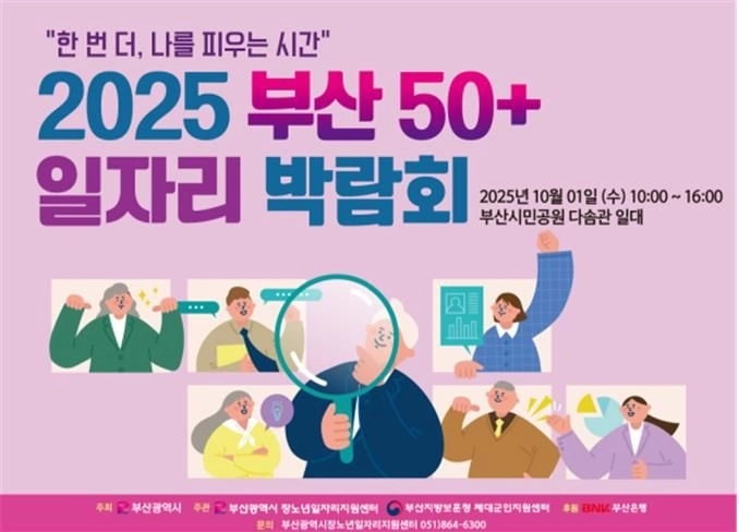 부산시는 다음달 1일 오전 10시부터 오후 4시까지 부산시민공원 다솜관 일대에서 신중년 세대의 인생 2막 도전을 지원하는 ‘2025년 부산 50+일자리 박람회’를 개최한다고 30일 밝혔다.