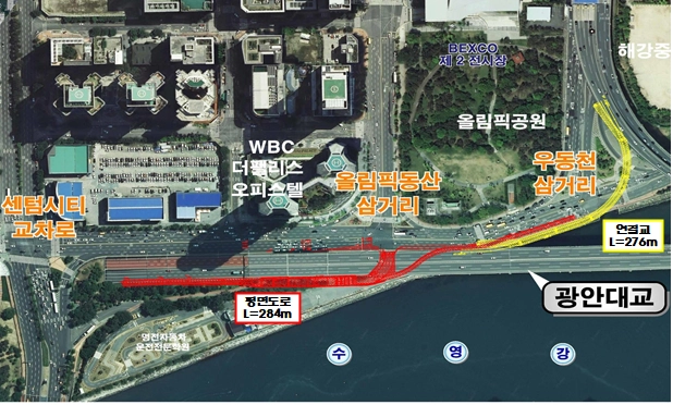 이번 공사는 해운대구 센텀시티 교통혼잡 해소를 위해 추진 중인 ‘광안대교 접속도로 연결공사’의 하나다. 광안대교 차로 조정은 이번에 설치가 완료된 램프 교량에서 내려오는 차량과 광안대교를 직진 통행(용호동→센텀시티 방향)하는 차량간 접촉 사고를 막기 위한 것이다.