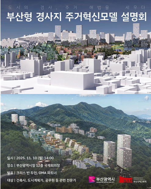 부산시는 10일 오후 2시 시청 국제회의장에서 세계적 건축그룹 오엠에이(OMA)와 ‘도시의 경사, 주거 해법을 세우다 - 부산형 경사지 주거혁신모델 설명회’를 연다.