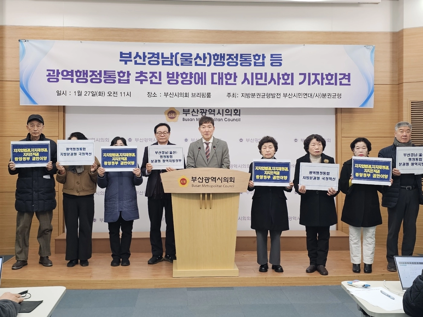 지방분균 균형발전 부산시민연대와 사단법인 분권균형은 27일 부산시의회 브리핑룸에서 기자회견을 열고 “대통령과 행정통합을 추진하는 광역자치단체의 장이 참여하는 ‘행정통합 추진 협의회’를 구성하자고 제안했다.