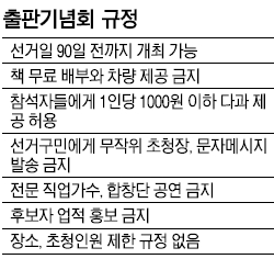 반면 출판기념회에 대한 부정적인 여론을 최소화하기 위해 차별화를 시도하는 이들도 있다. 지난달 25일 출판기념회를 한 한범덕 청주시장은 직원들을 오지 말라고 해 시청 간부 5명 정도만 참석한 것으로 알려졌다. 오는 22일 문화회관에서 출판기념회를 여는 홍성열 증평군수는 책 판매대금의 일부를 군민장학회와 사회복지공동모금회에 기탁할 예정이다. 강운태 광주시장, 강진원 강진군수, 김석현 전 전남도 부교육감은 아예 출판기념회를 취소했다.