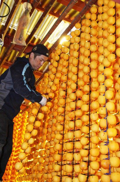 쫀득쫀득한 가을이 주렁주렁  20일 충북 영동에서 한 농민이 곶감 말리는 작업을 하고 있다. 전국의 7%이자 충북의 70%에 이르는 감을 생산하는 영동에서는 한 해 2500t, 65만접(1접은 100개)의 곶감이 출하된다.<br>영동 연합뉴스