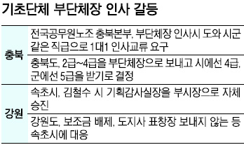 강원도 역시 비슷한 상황이다. 속초시가 인사적체 해소 등을 이유로 지난달 24일 김철수 시 기획감사실장을 부시장으로 자체 승진시키자 강원도가 보조금을 삭감하고 시 공무원들에 대한 도지사 표창장을 보내지 않는 등 강력 대응에 나섰기 때문이다. 전공노 강원지역본부는 “인사권은 해당 단체장의 고유 권한인데 강원도가 이번 인사를 빌미로 보복을 취하는 것은 기득권을 지키기 위한 망동”이라며 “관행적으로 강원도가 쥐고 있던 인사권의 형평성을 되찾을 수 있도록 투쟁에 돌입하겠다”고 반발하고 있다.