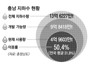 그러나 이미 충남의 지하수 이용이 전국 평균을 웃돈다. 연간 충남 전체 지하수량 13억 6227만t 중 개발 가능량은 9억 8418만t으로 이미 4억 9603만t이 사용 중이다. 이용률이 50.4%로 전국 평균 31.8%보다 훨씬 높다. 특히 제한급수 중인 시·군이 높아 더 심각하다. 가장 높은 태안군(69.6%)과 당진시 66%, 서산시 65.8%, 홍성군 58.5% 등이다.