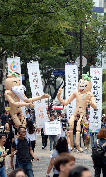 16일 서울 중구 명동거리에서 금산인삼축제 관계자들이 인삼인형을 들고 퍼레이드를 펼치고 있다. 금산인삼축제는 다음달 24일부터 10월 3일까지 충남 금산의 금산인삼관 광장 및 인삼약초거리 일대에서 진행된다. 이곳에세는 금산세계인삼엑스포가 내년 9월 8일부터 10월 9일까지 열릴 예정이다.