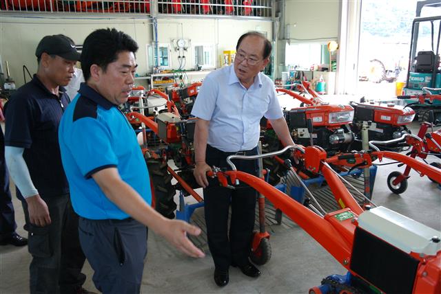 류 군수는 가곡면 향신리 농기계임대사업소에 도착하자마자 현장에서 회의를 가졌다. 단성면 중방리에 추진 중인 농기계임대사업소 북부지소 진입로 공사와 농기계인력지원단 확대 운영이 다뤄졌다. 군청 회의실을 옮겨 놓은 듯했다.