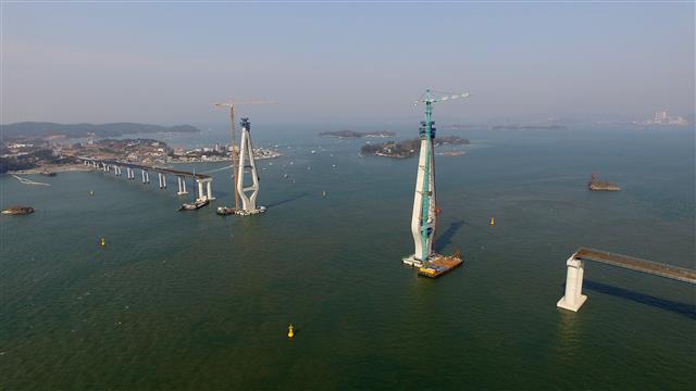 국내 최장의 해저터널과 함께 충남 보령 대천항과 태안 안면도 영목을 잇는 연륙교가 웅장한 모습을 드러내고 있다. 해저터널과 연륙교는 2020년 말 전면 개통될 예정이다. 충남도 제공