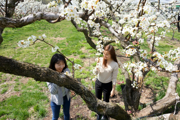 20일 충북 영동군 과일나라테마공원 내 자리잡은 배나무의 하얀 배꽃을 도민들이 감상하고 있다. 영동군은 100년이 넘은 배나무 20그루를 관리하고 있다.