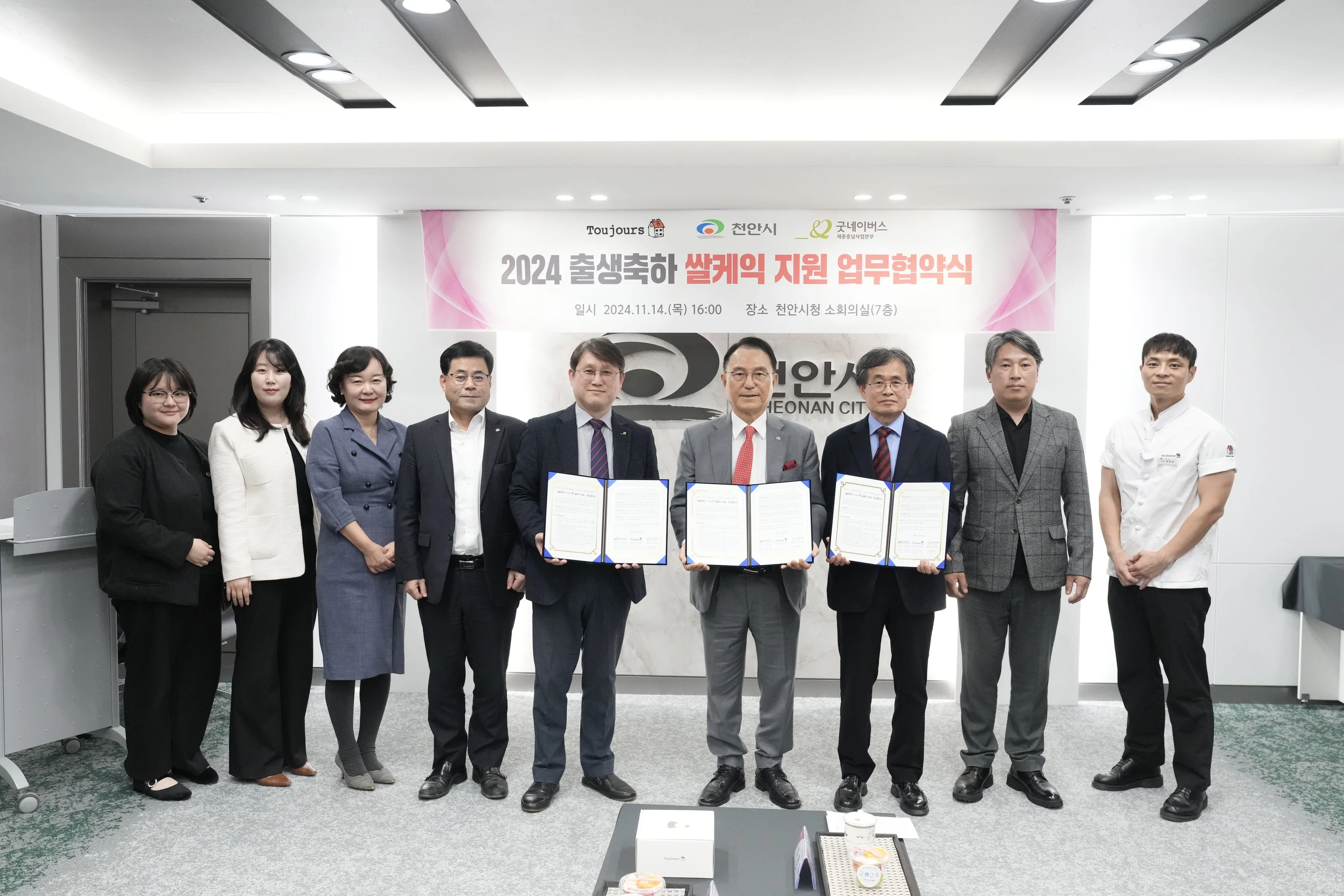 천안시는 14일 뚜쥬루과자점, 굿네이버스 세종충남사업본부와 ‘출생 축하 쌀케이크 지원’을 위한 업무협약을 체결했다.