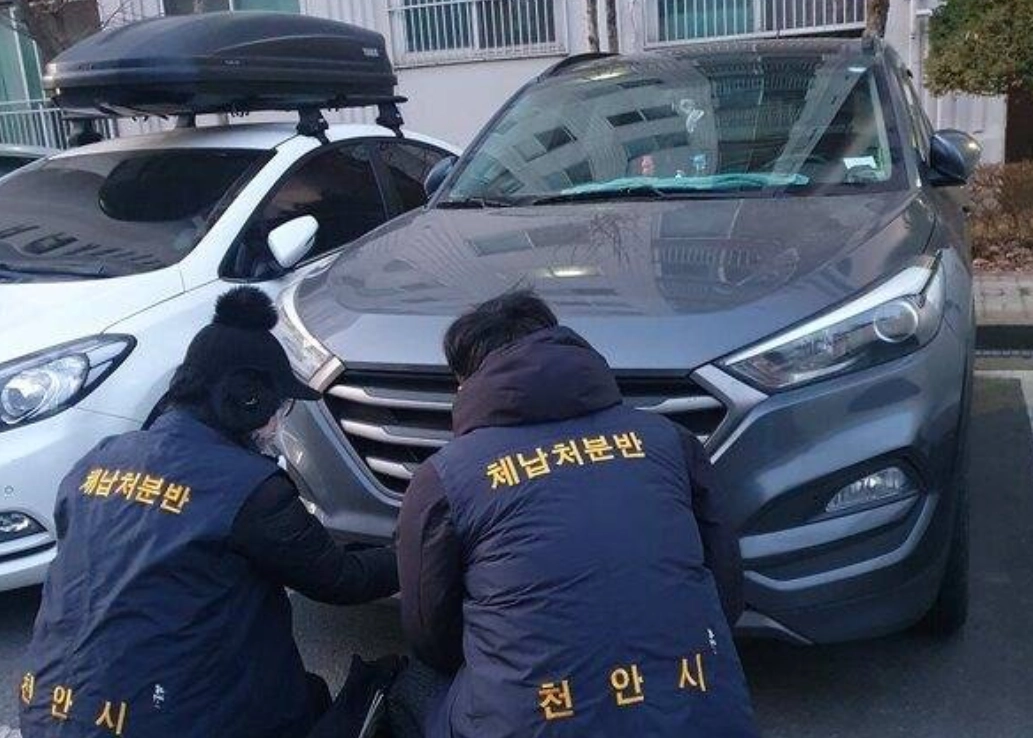 충남 천안시 관계자들이 체납 차량의 번호판을 영치하고 있다. 천안시 제공