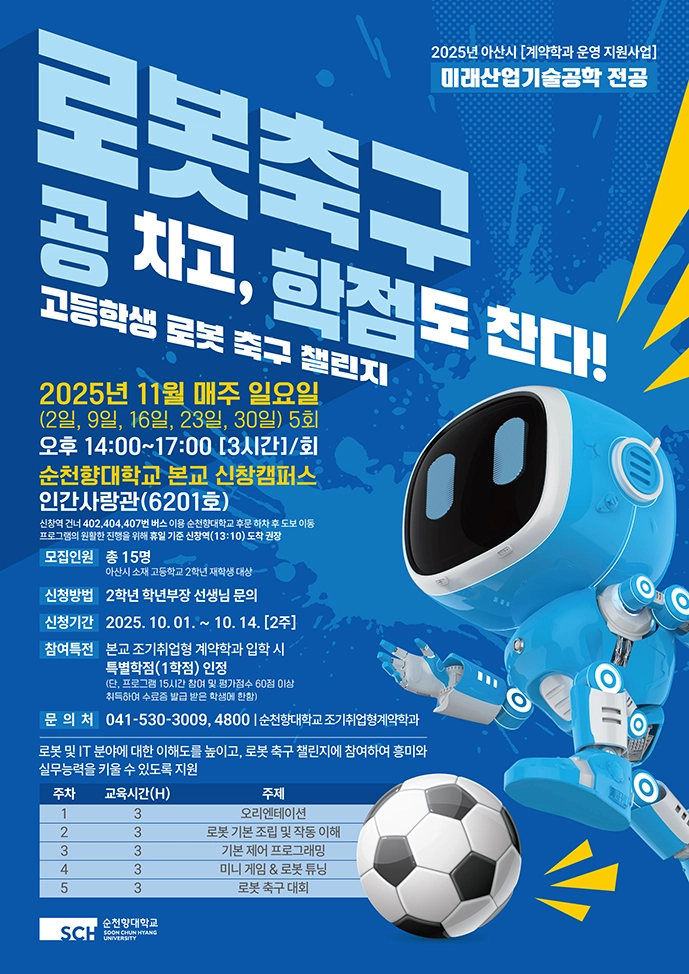 아산시 계약학과 운영 지원사업 목적으로 추진되는 이번 프로그램은 첨단융합공학부의 미래산업기술공학과 미래바이오융합공학 전공 중심으로 운영한다.