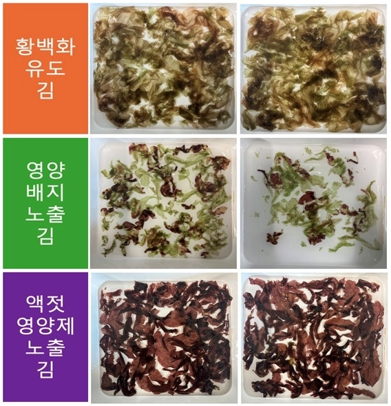 현장 검증에서도 액젓 찌꺼기 치료제 처리 김에서는 질소 함량이 7.4%에서 8.3%로 증가했다. 세포 색깔이 진해지고, 밀도와 광택도 달라지는 등 김 세포의 형태적·생리적 변화도 확인됐다.