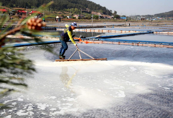 8일 충남 태안군 근흥면 마금리 일대 염전에서 한 어민이 송화소금을 생산하고 있다. 송화소금은 해송과 염전이 많은 태안 지역의 대표 특산품으로 1년 중 송홧가루가 날리는 5월 초와 중순, 딱 일주일 정도만 생산할 수 있어 희소성이 높다.
