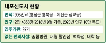 대전에 있던 충남도청이 2012년 말 홍성·예산으로 이전하면서 조성된 내포신도시는 현재 인구 2만 4000여명에 그친다. 당초 2020년 목표인구 10만명은 불가능한 상황이다. 대형 병원·할인점 등 편의시설도 부족하다.
