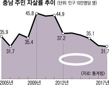 도가 이처럼 나선 것은 높은 자살률 때문이다. 충남은 2005년, 2006년과 2009년, 2010년 자살률이 전국 1위였다가 7년 만인 지난해 인구 10만명당 31.7명이 자살해 다시 1위를 차지했다. 노인 자살률도 65세 이상 인구 10만명당 2016년 68.3명으로 2위, 지난해 65.1명으로 1위다. 백 과장은 “충남은 노인 자살이 전체 자살의 3분의1일 넘을 정도로 심각하다”며 “이처럼 자살률이 높은 것은 경제적인 이유나 질병도 있지만 우울증이 크게 작용한다. 이는 잘 참아 화병이 도지는 지역적 기질과 관계가 있는 듯하다”고 말했다.